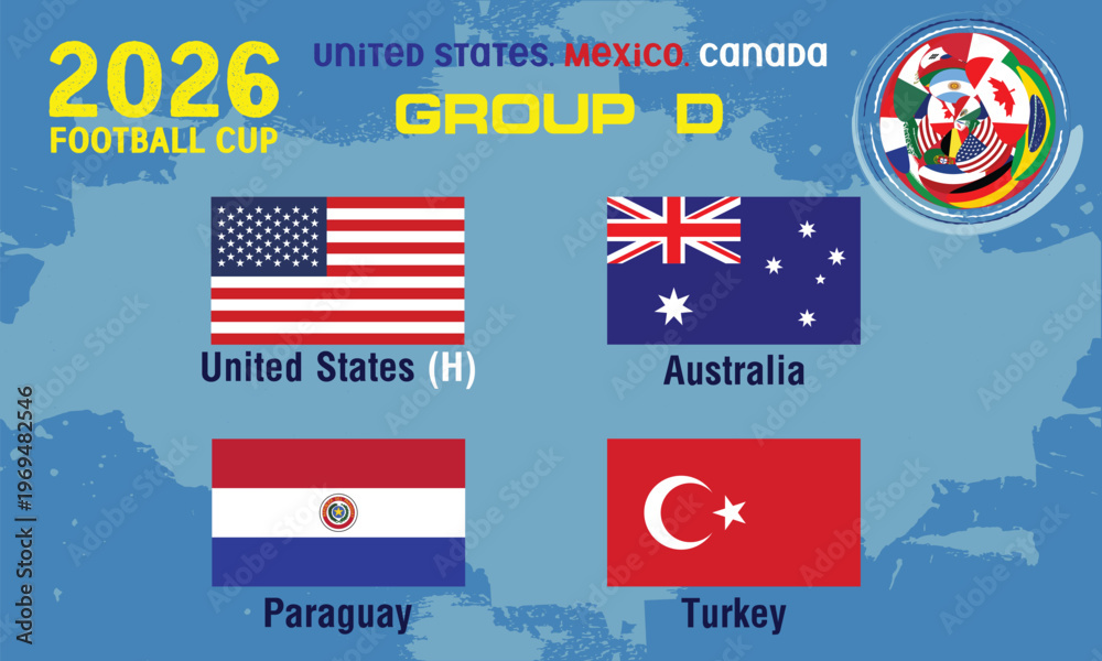 United States,Australia,Paraguay,Turkey, Countries and Flags soccer championship group D, 2026 football tournament group D. The 2026 football championship in the USA, Canada, and Mexico.eps #1969482546