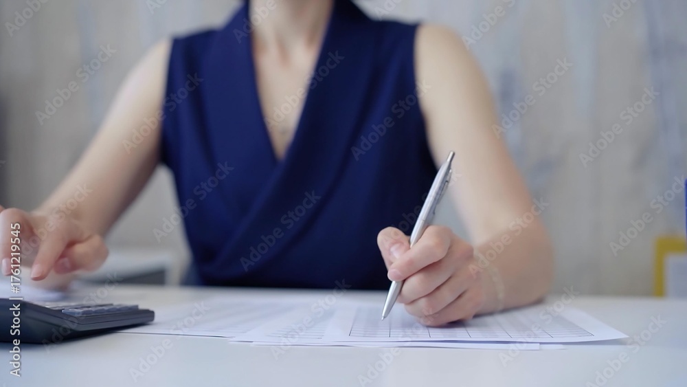 Unknown accountant businesswoman is using calculator and taking notes. Taxes, audit in business #1761219545