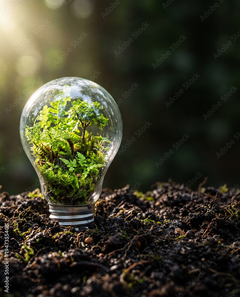 Upright Lightbulb Containing Miniature Forest on Rich Soil#1947355406