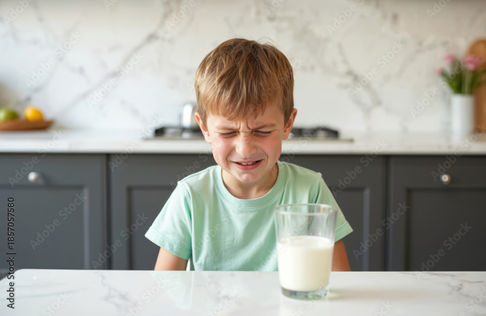 Upset boy makes grimace dislike drinking milk for breakfast. Child refuses white beverage sits kitchen table. Youngster loss appetite shows disgust face. Healthy eating struggle. #1857057580