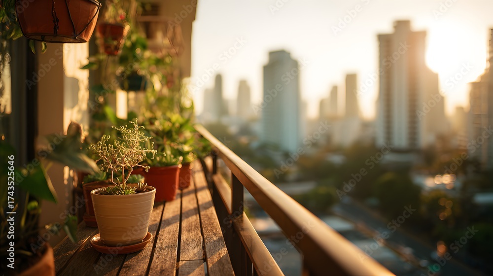 Urban balcony scene showcasing a diverse array of potted plants against a backdrop of a cityscape at sunrise. #1743525646