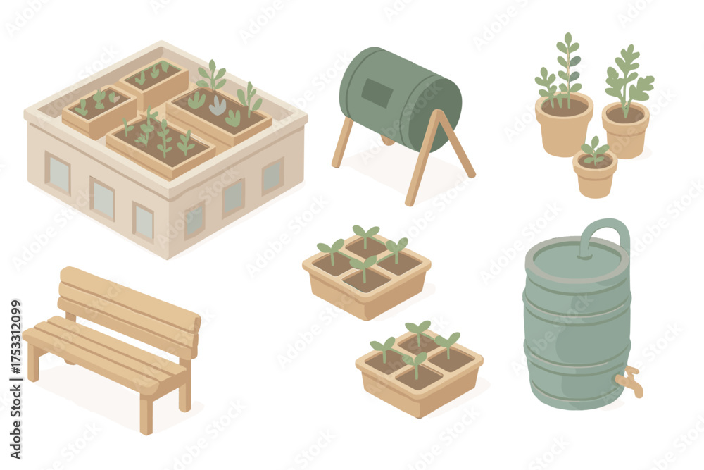 Urban Garden Icons. Isometric vector illustration set Urban community garden: rooftop planters, compost tumbler, herb pots, garden #1753312099
