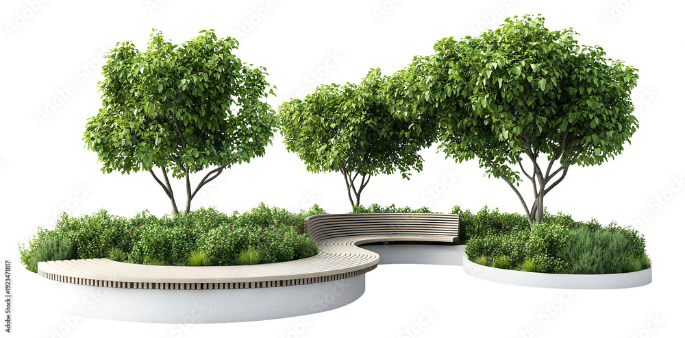 Urban landscaping bench with trees and bushes, isolated on transparent cutout background #1923471817