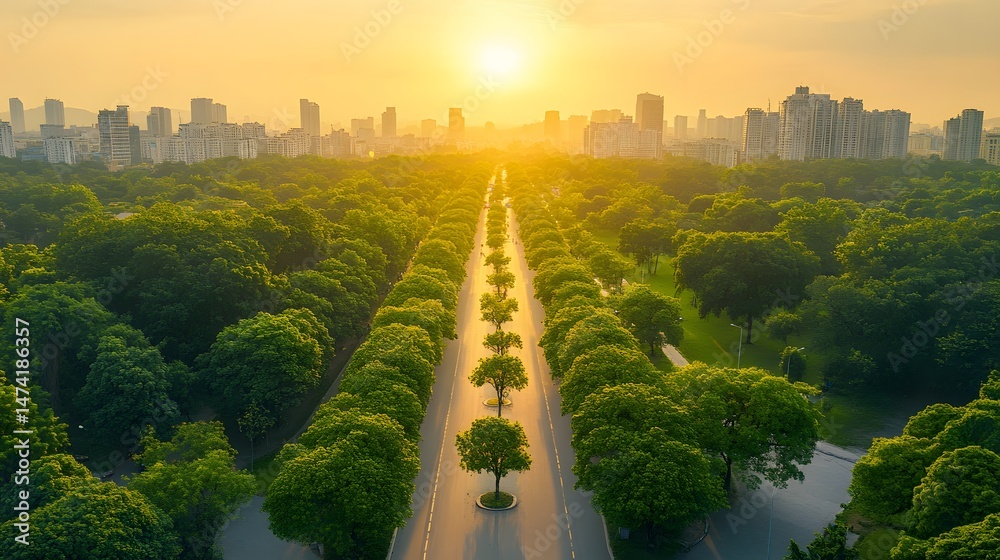 Urban park pathway stretching to a sunrise over the city. #1474186357