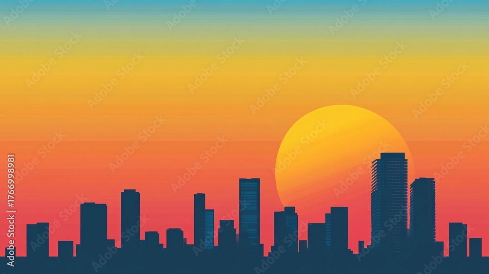 Urban skyline silhouetted against a vibrant sunset with warm hues of orange and blue in the evening sky #1766998981