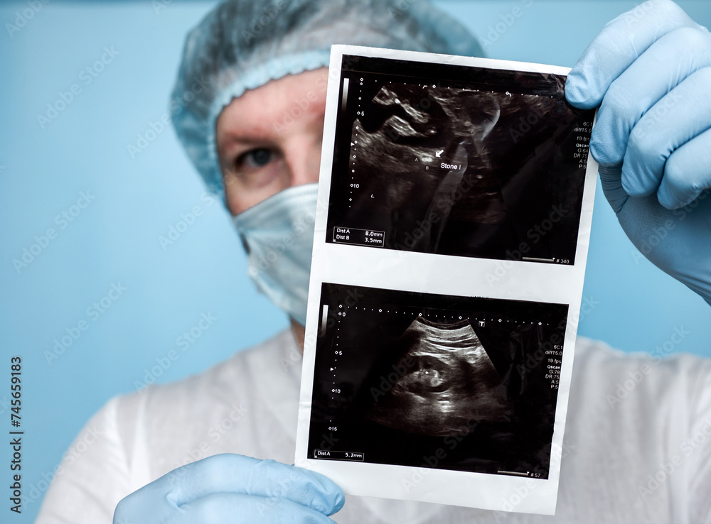 Urologist doctor analyzes an ultrasound of a person's kidney, a stone or calculus in the kidney on an ultrasound. Male urinary tract disease. #745659183
