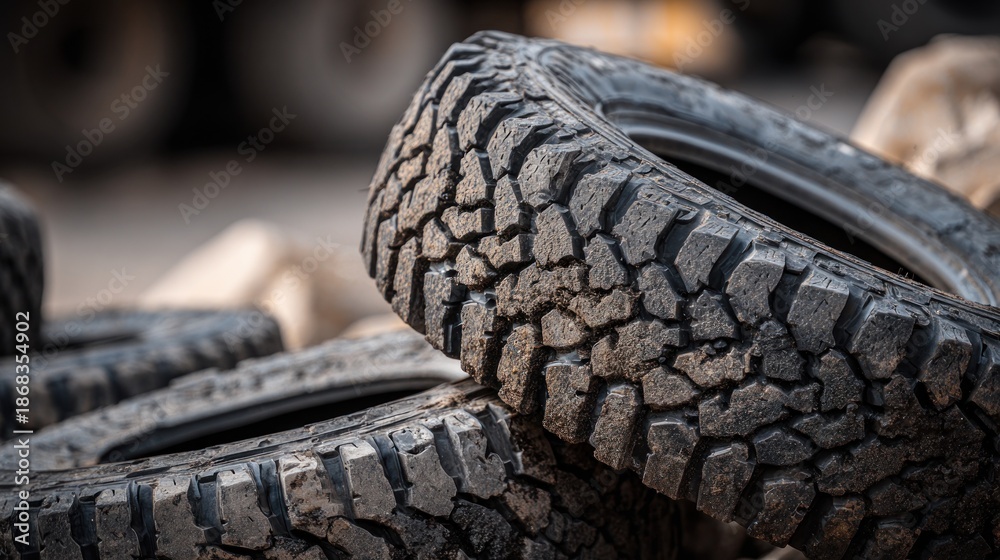 Used tires stacked at a vehicle repair shop in a busy urban area during the afternoon #1868354902