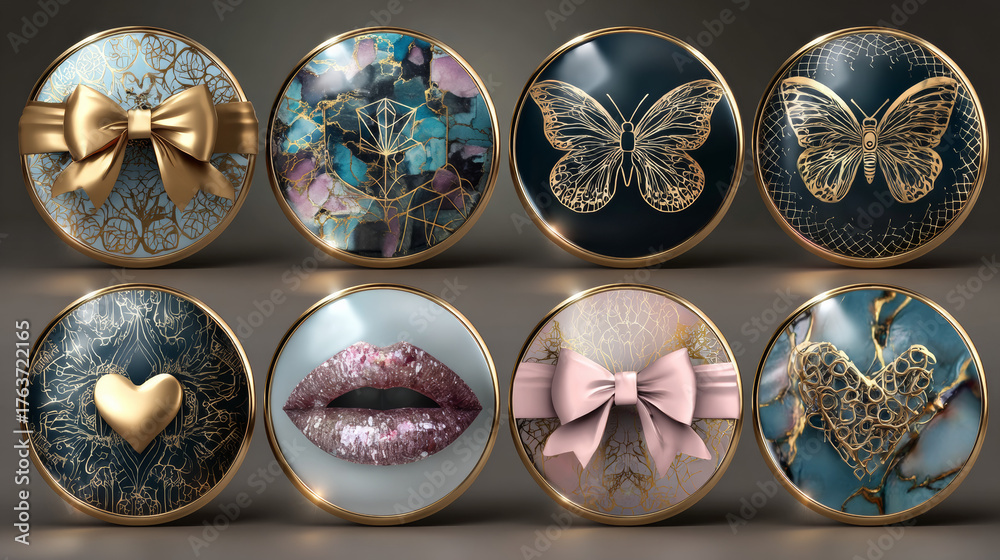 Сute set of gold gift stickers in round shape for gifts with outline hand drawn bow, lips, heart with inscription, colorful trendy label, vector illustration EPS10. Element for wrapping paper, logo #1763722165