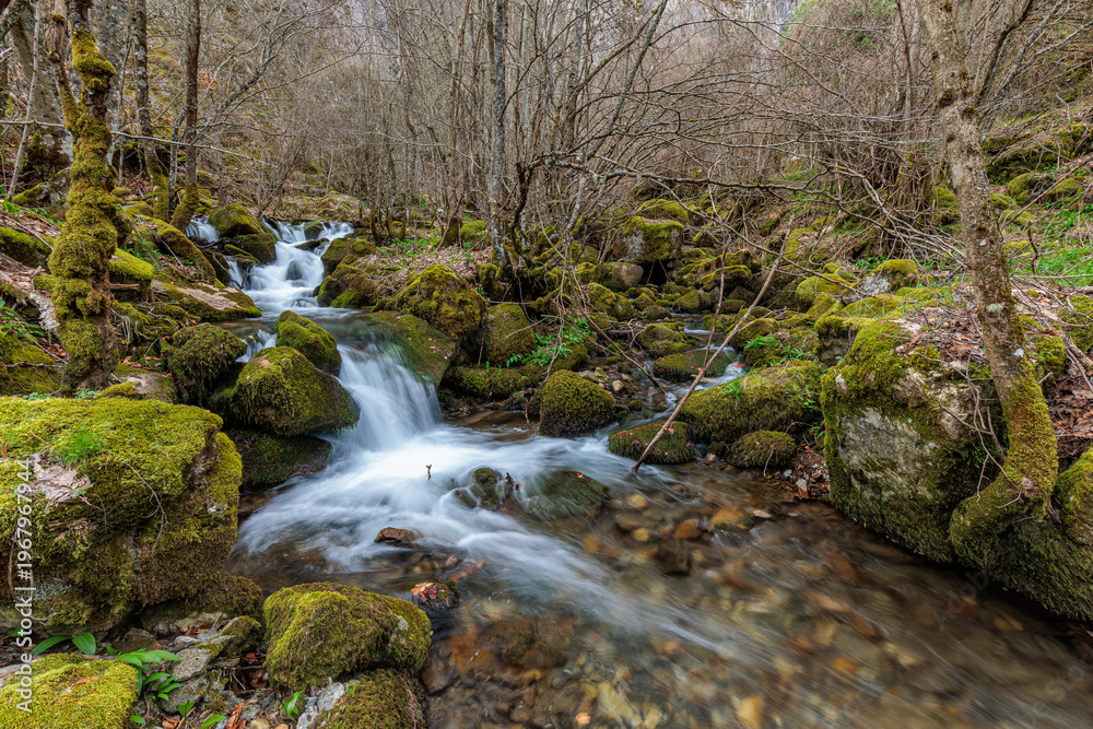 Valdecuevas stream crossing the forest with moss-covered rocks, Cabornera de Gordón, León, Spain. #1967967944