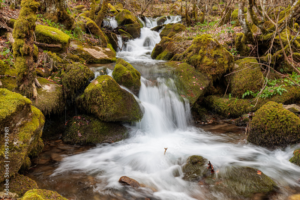 Valdecuevas stream flowing between moss-covered rocks, Cabornera de Gordón, León, Spain. #1967967981
