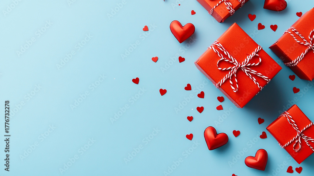Valentine's Day background with red gift boxes, scattered hearts, and a light blue empty copy space for text or design. #1776732278