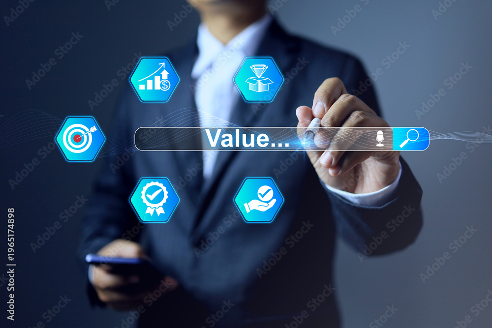 value proposition concept with businessman searching on search bar represents define core value activity such as quality, creativity, honesty and right #1965174898
