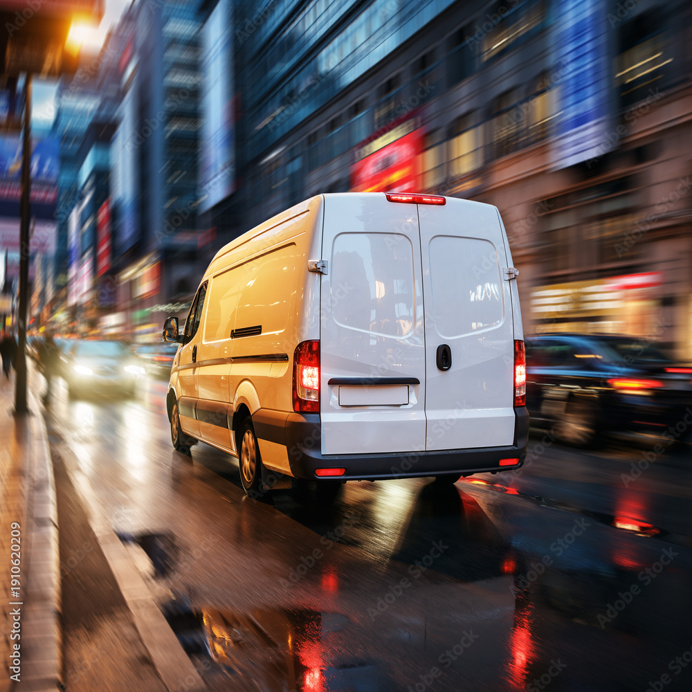 Van drives through a busy city street at dusk with lights reflecting on wet pavement #1910620209