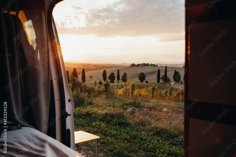 Vanlife - live in a beautiful bus in the open nature surrounded by grapevines #412329228