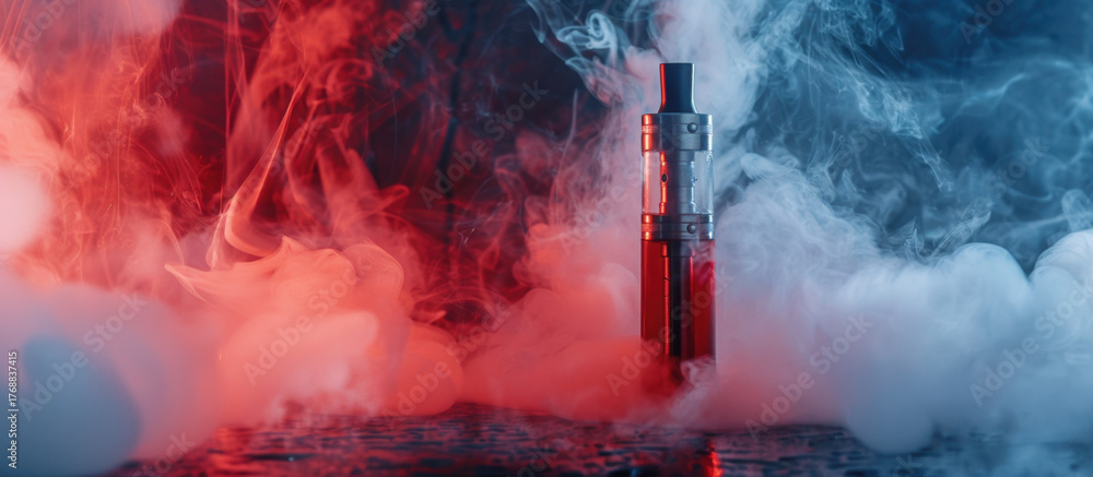 Vape amidst the mist: A modern electronic cigarette stands enveloped in a swirl of colorful vapor, creating a visually striking display of innovation and atmosphere. #1768837415