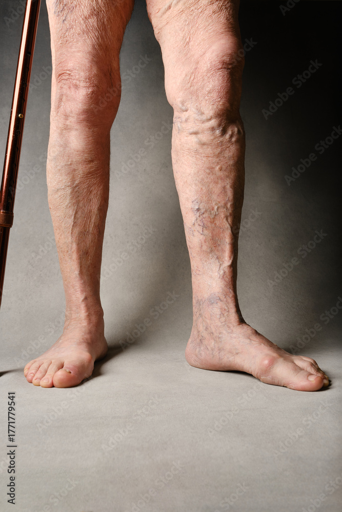 Varicose veins on a female legs. Legs of an elderly woman with a walking stick #1771779541