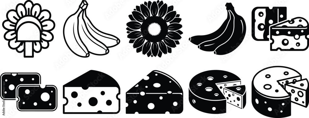 Varied collection of common food elements featuring sunflowers, ripe bananas, and sliced cheese for menu illustrations #1769967464