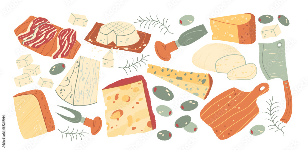 Varieties of cheese in retro cartoon style. Antipasti set: mozzarella, gouda, parmesan, olives, grapes. Gourmet snack,cheese plate composition, illustration in funky, doodle style, sticker set. #1892119034