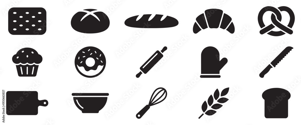 Various baking and bakery items icon collection set representing essential tools and delicious treats for homemade cooking. #1930663837