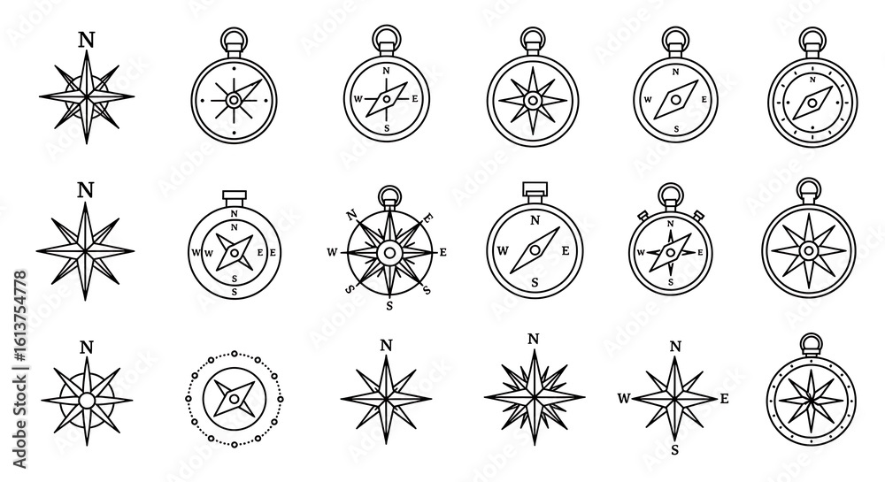 Various compass designs in a grid layout featuring line art styles and navigational elements shown #1613754778