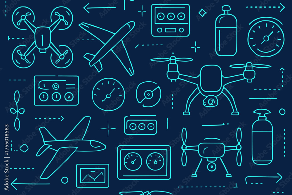 Various drones, aircraft, and flight instruments illustrated in a seamless pattern on a dark blue background #1755018583
