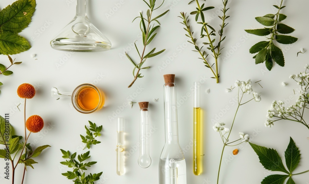 Various medicinal plants and test tubes on white laboratory table #868018111