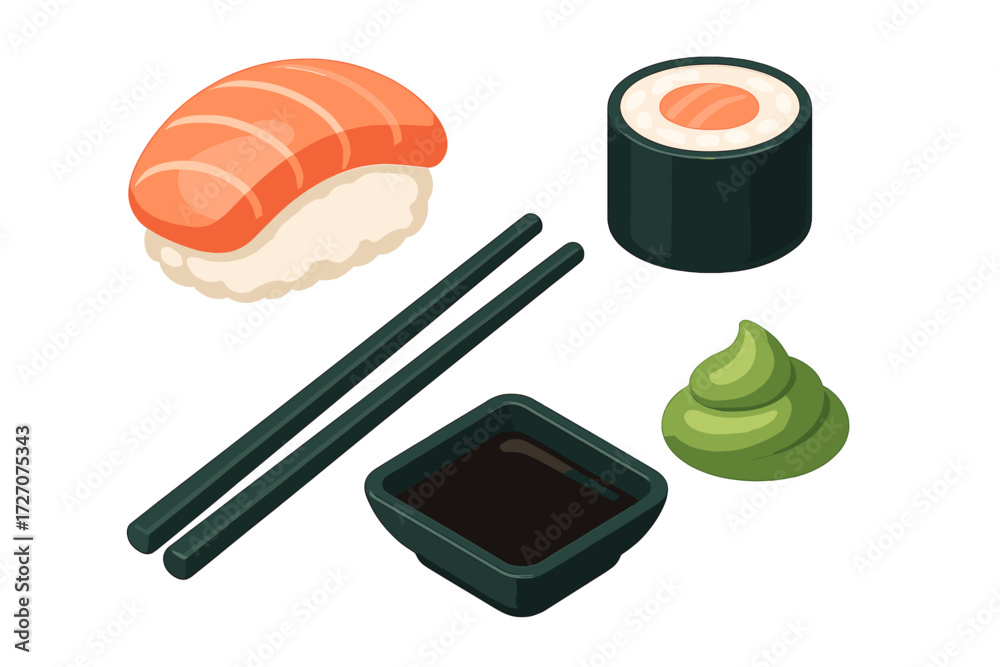 Various types of sushi with chopsticks, wasabi, and soy sauce on a plain background for culinary presentation #1727075343