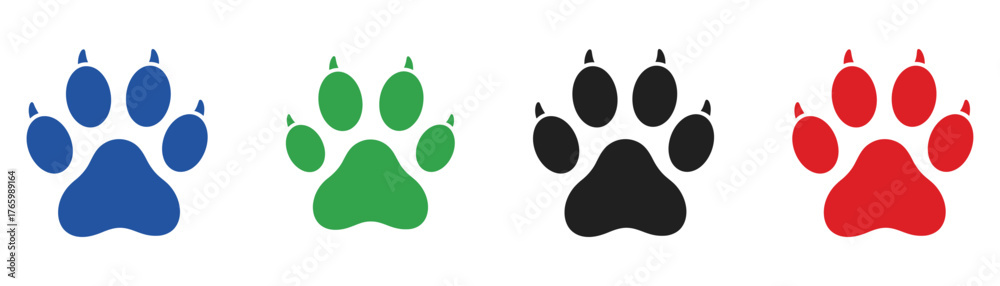 Vector art of four colorful paw prints blue, green, black, and red, each with distinct claws, arranged in a horizontal row on transparent background #1765989164