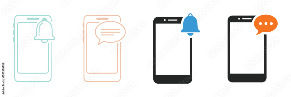 Vector art of illustrations of mobile phones displaying notifications, , including message bubbles and bell icons for alerts and communication on transparent background #1765990794