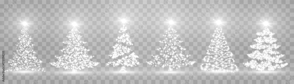 Vector Christmas tree made of glowing lights. Bright shiny Christmas light. Glittering lights in the form of a Christmas tree. White glowing spruce luxurious design. Vector on png background. #1781014288