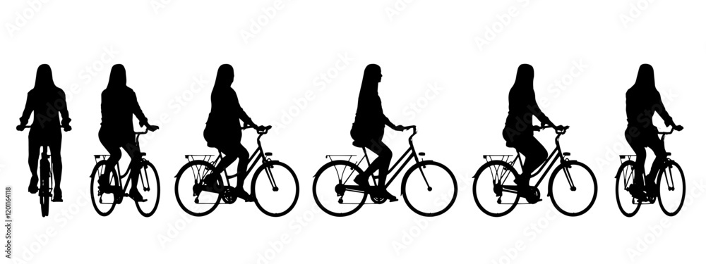 Vector concept conceptual black silhouette of a woman riding a bicycle from different perspectives isolated on white background. A metaphor for sport, fitness, health, transport, leisure and lifestyle #1201164118