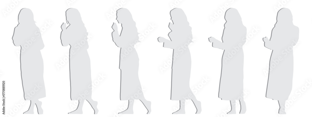Vector concept conceptual gray paper cut silhouette of a woman in a bathrobe from different perspectives isolated on white background. A metaphor for relaxation, wellness, beauty, health care and life #1770881920