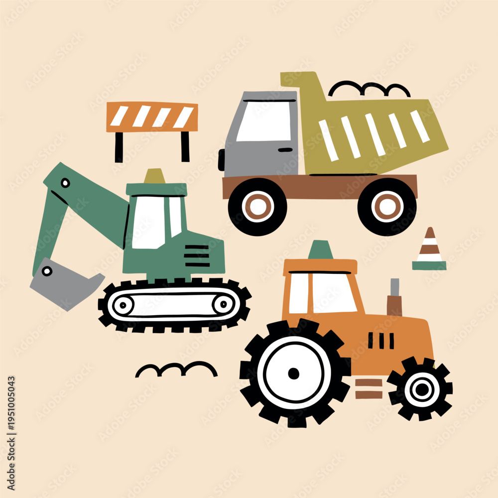 Vector construction truck clipart on isolated background. Hand drawn dumper and excavator illustration. #1951005043