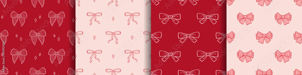 Vector cute seamless pattern collection with whimsical coquette ribbon bows on pink, red backgrounds. Charming pretty girly bow prints with outline doodles, sparkles for holiday gift wrap, textile. #1939129307