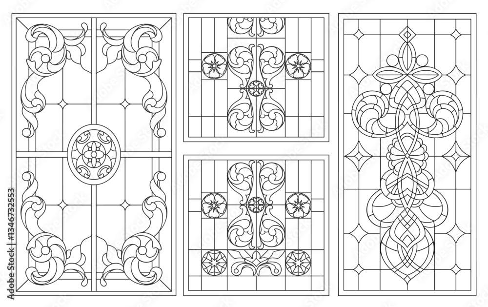 Vector elements. Blank for a classic stained-glass window with floral ornaments. Classic stained glass for a door or window #1346732553