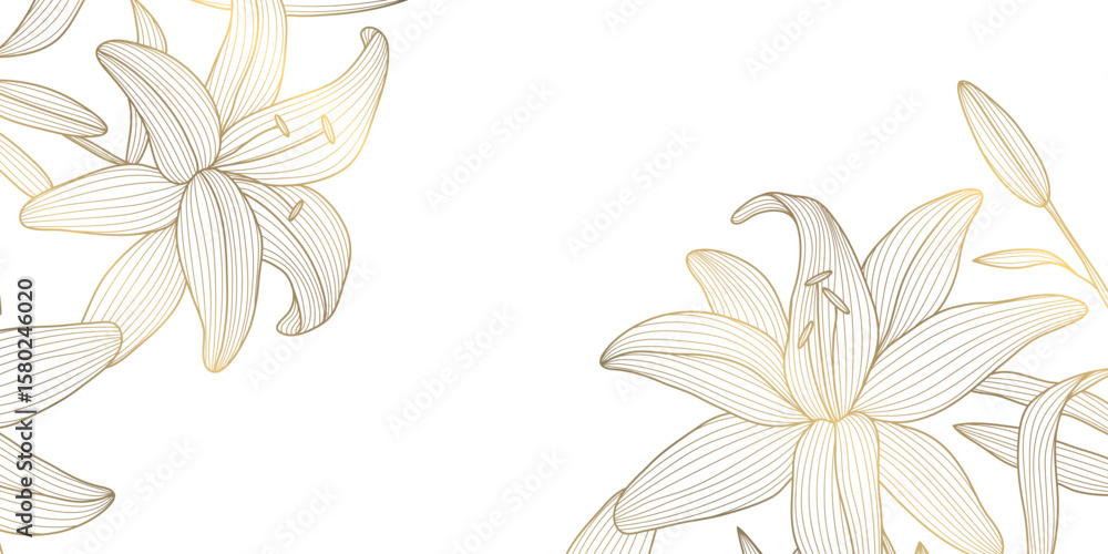 Vector flower gold line background, plant spring blossom corners, leaves floral lily frame. Chinese, japanese oriental nature border. #1580246020