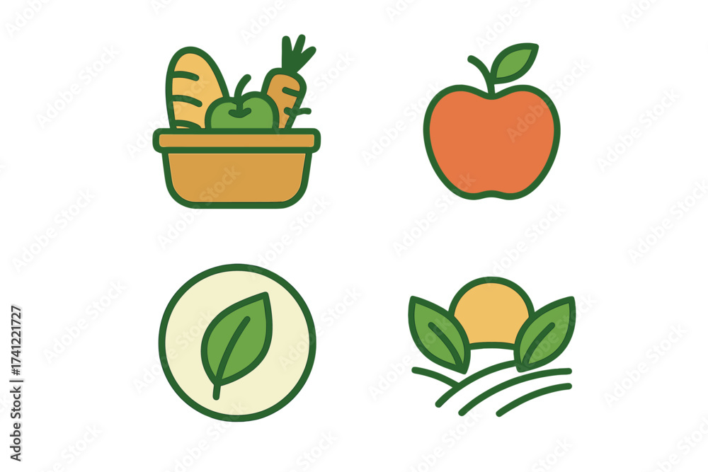 Vector food and organic logo icon collection. Fresh farm produce, grocery basket, apple fruit, and leaf symbols. Healthy eating, natural products, and agriculture concepts. #1741221727