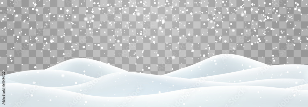 Vector heavy snowfall with snowbanks field. Snow landscape decoration, frozen hills isolated on png background. Snow flakes, snow and blizzard falling on snowdrifts. Christmas vector illustration #1641494422