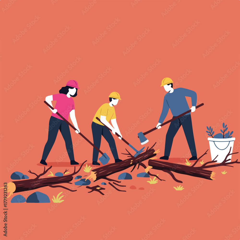 Vector illustration depicting three individuals working together to clear debris. Background is solid, orange #1779231263