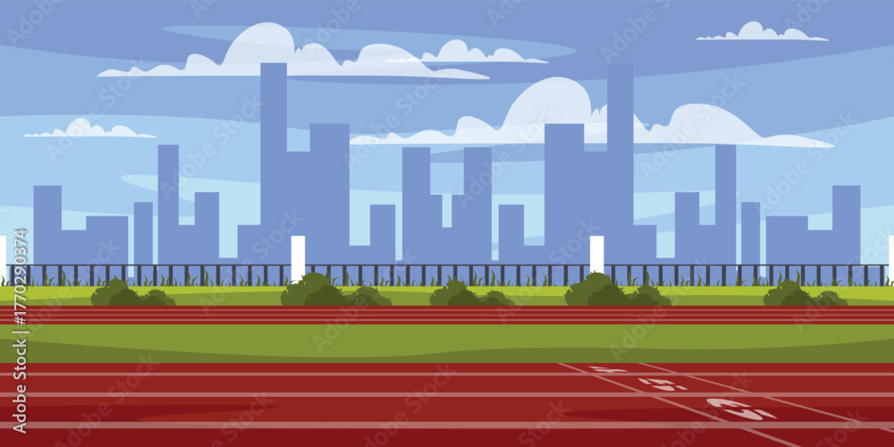 Vector illustration of a city landscape with sports areas for outdoor training. Cartoon scene of a sports ground with asphalt surface, markings, numbers, fence, silhouettes of multi-storey buildings. #1770290374