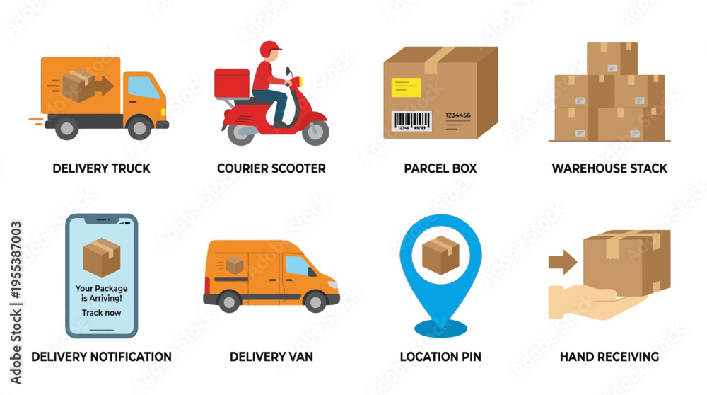 Vector illustration of a delivery process with a courier scooter, truck, and van transporting parcel boxes to a location marked by a pin. #1955387003