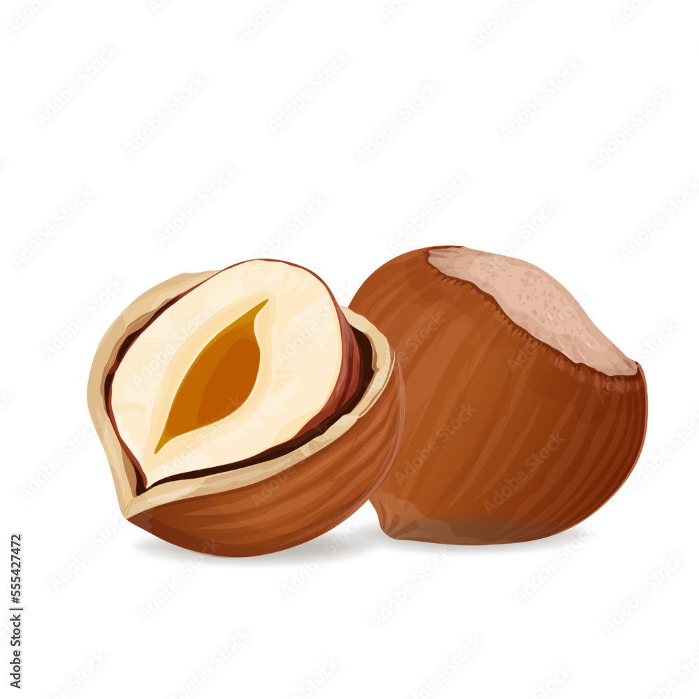 Vector illustration of a hazelnut peeled whole, chopped into halves. . Vector icon on the white background. #555427472