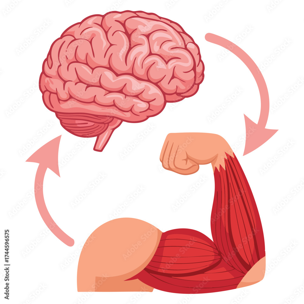 Vector illustration of brain and muscle fiber connection highlighting neuromuscular relation unity of mental and muscular growth and directional impulses #1744596575
