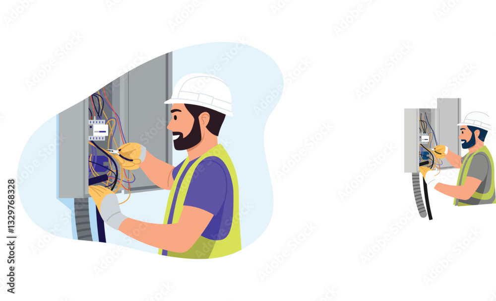 Vector illustration of electrician specialist. Cartoon scene of electrician repairing wires in meter, in protective gloves, holding pliers, dressed in vest, helmet isolated on white background. #1329768328