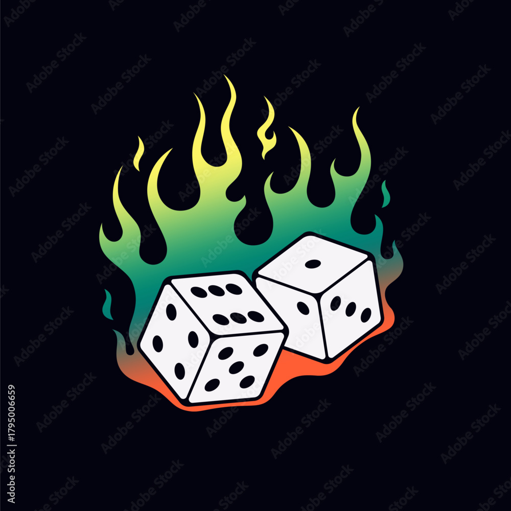 Vector illustration of two dice in fire flames. Burning dice symbolizing luck, risk, passion, and gambling. Perfect for casino, gaming, and entertainment design projects. #1795006659