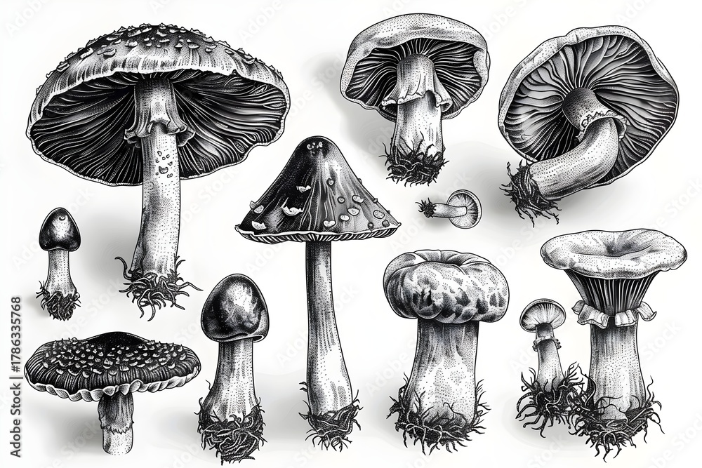 Vector illustration of various mushrooms in tattoo style showcasing intricate details and textures #1786335768