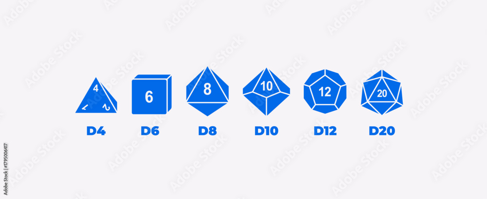 Vector illustration set of D4, D6, D8, D10, D12, and D20 dice icons isolated on white background. Polyhedral gaming dice collection for tabletop, RPG, and board game design projects. #1795006417