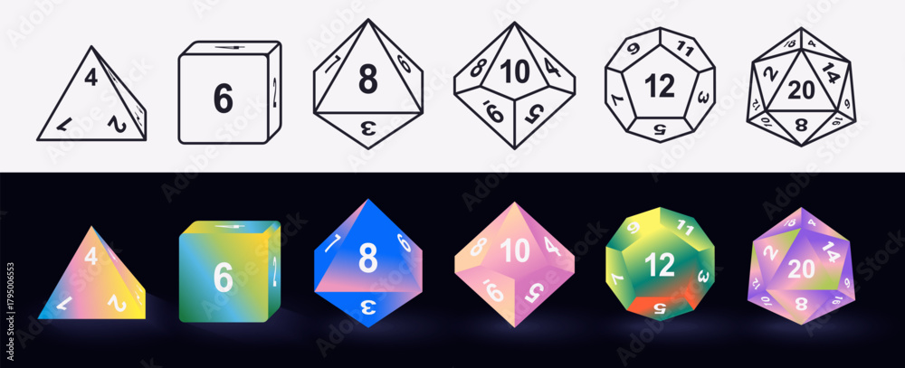 Vector illustration set of D4, D6, D8, D10, D12, D20 dice icons isolated. Polyhedral gaming dice collection for tabletop, RPG, and board game design projects. Vibrant gradient colors. #1795006553