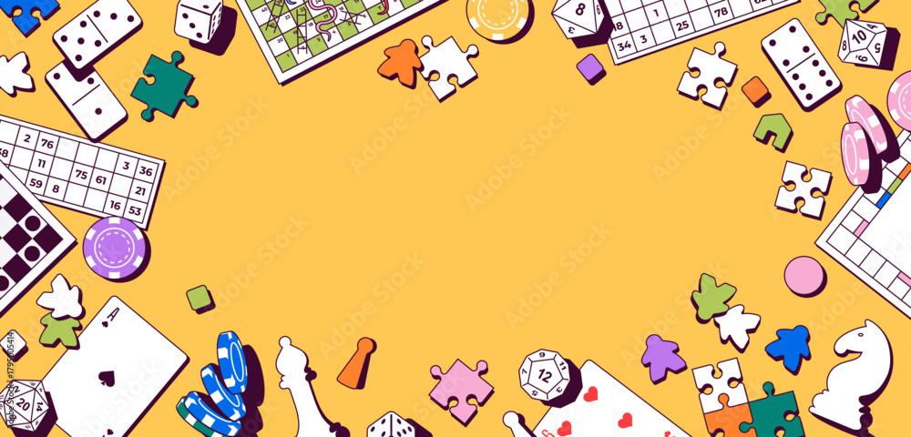 Vector illustration with various board games and playing elements. Includes chess, poker chips, domino, dice, cards, puzzles, and meeples. Perfect for game design, hobby, entertainment events. #1795005414