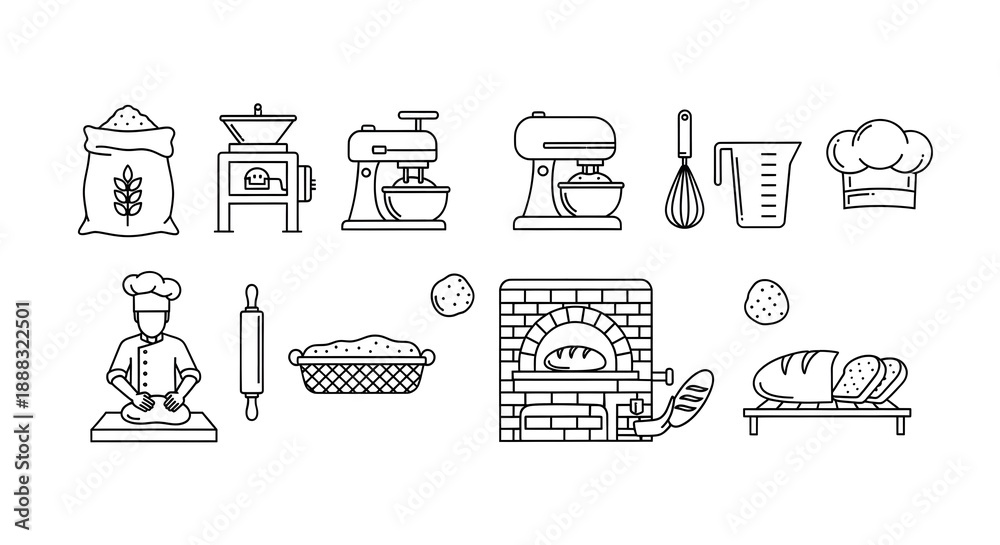 Vector line art illustrating various baking tools and ingredients for a bakery #1888322501